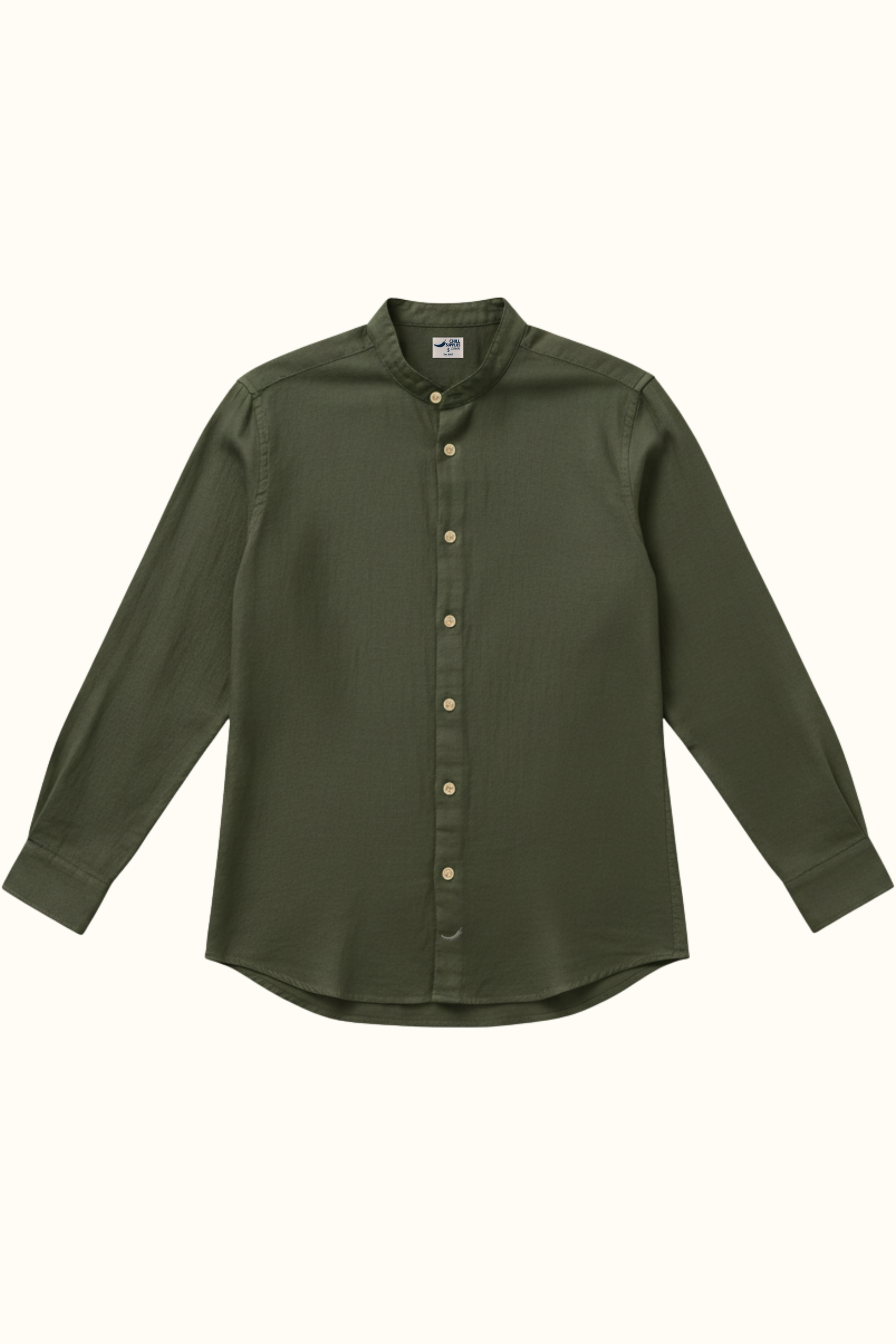 Cuello mao, 7 botones, nuestro característico logo bordado en la tapeta.